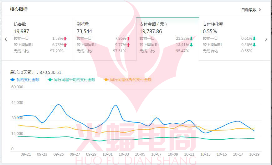 接手后火蝠團隊進行了行業分析和自身店鋪數據分析,與掌柜溝通了解產品的優勢以及操作時間節點。后面直通車推廣方向上進行了大幅度調整,對產品內頁進行優化重新挖掘賣點。重新把品牌詞的的權重拉起來。10月份銷售額70萬。